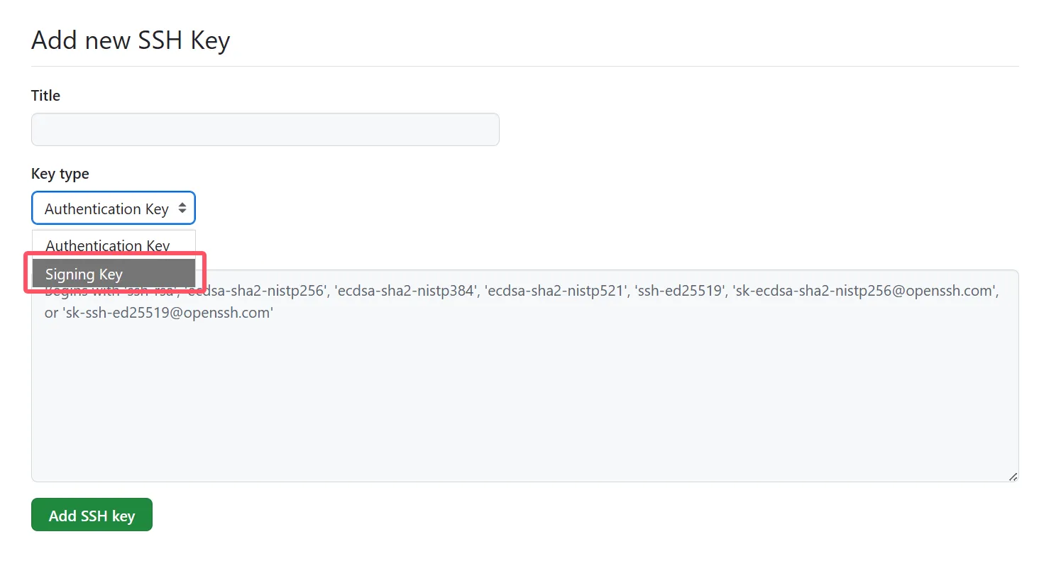 然后在 GitHub 上添加 SSH 公钥,类型选择为 Signing key。