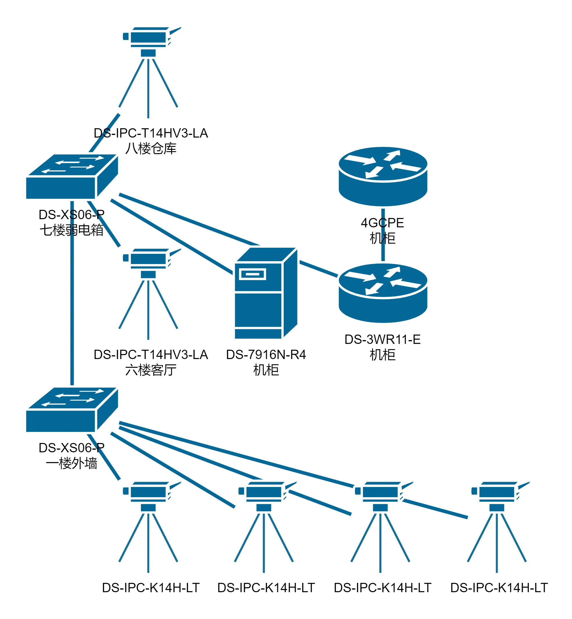 一楼四个角的监控直接通过墙面和外墙上监控箱内的交换机连接即可。然后监控箱内出一条总线连入电梯井,一路向上通到七楼弱电箱的交换机。七楼弱电箱的交换机除了和机柜的录像机连接外,还负责连接六楼和八楼的两个球机。