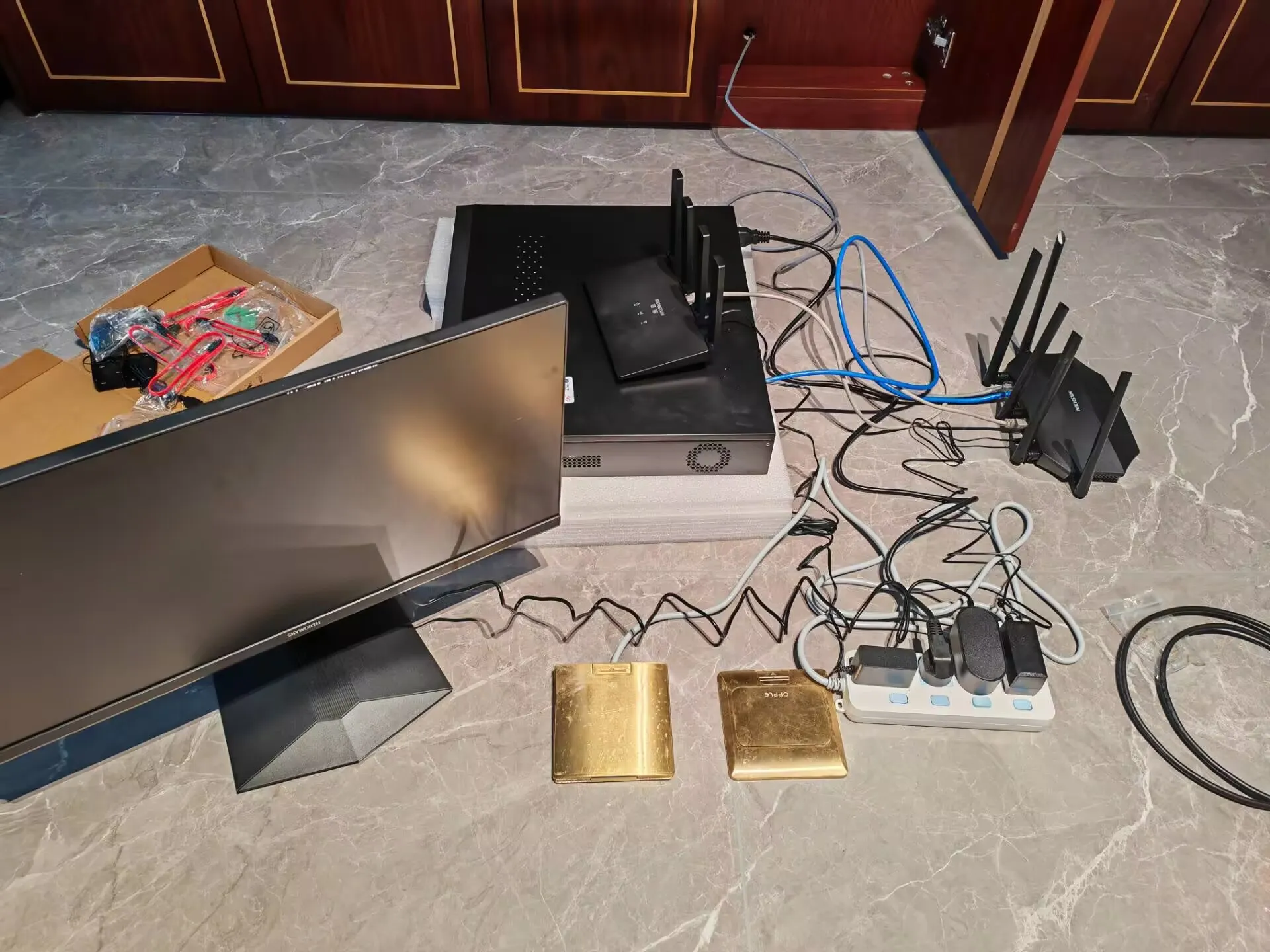 图中缺少了 4GCPE,此时还没到货。显示器原本打算去附近电脑店随便收一个百元破烂的,但是一个二手 24 寸 1080p 都要价 400r,只能作罢,于是立即某多多 392r 购入全新创维 23.8 寸 1080p,甚至还是 180 高刷。