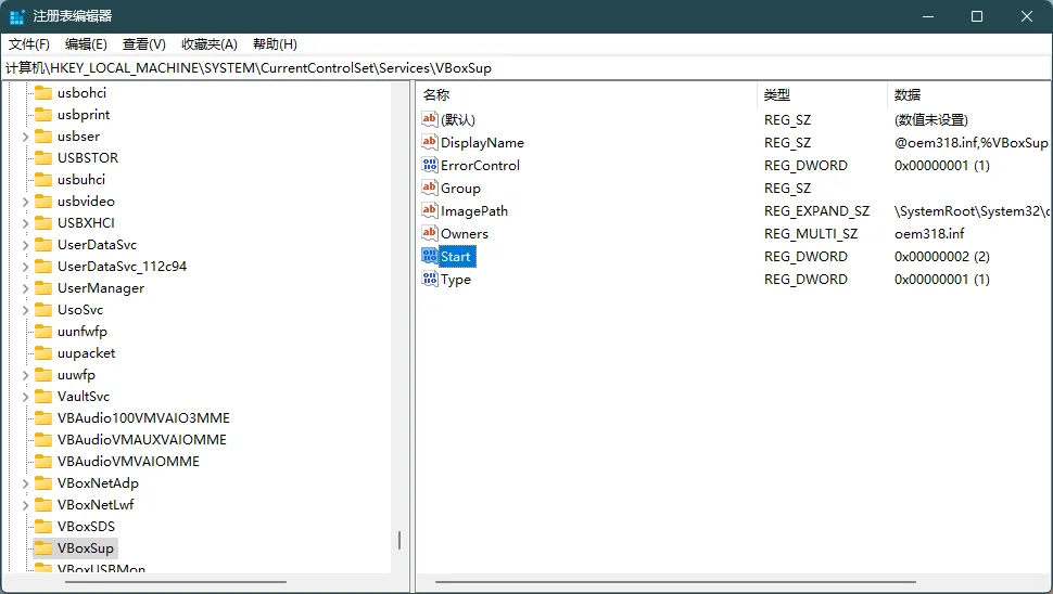 尝试了网上的一些办法,只需要将 HKEY_LOCAL_MACHINE\SYSTEM\CurrentControlSet\Services\VBoxSup 的 Start 值从 1 更改为 2 即可。重启后再进入虚拟机,就可以正常使用了。
