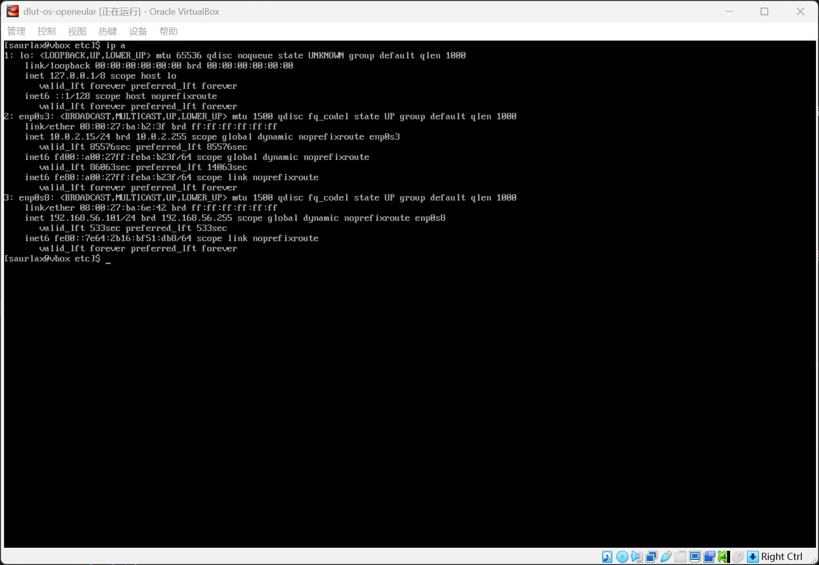随后进入虚拟机运行 ip a 查看网络信息,可以看到多了一个网卡 enp0s8,这个网卡的 IP 地址就是虚拟机的 IP 地址。如果没有显示 IP 地址,需要手动启用网卡。