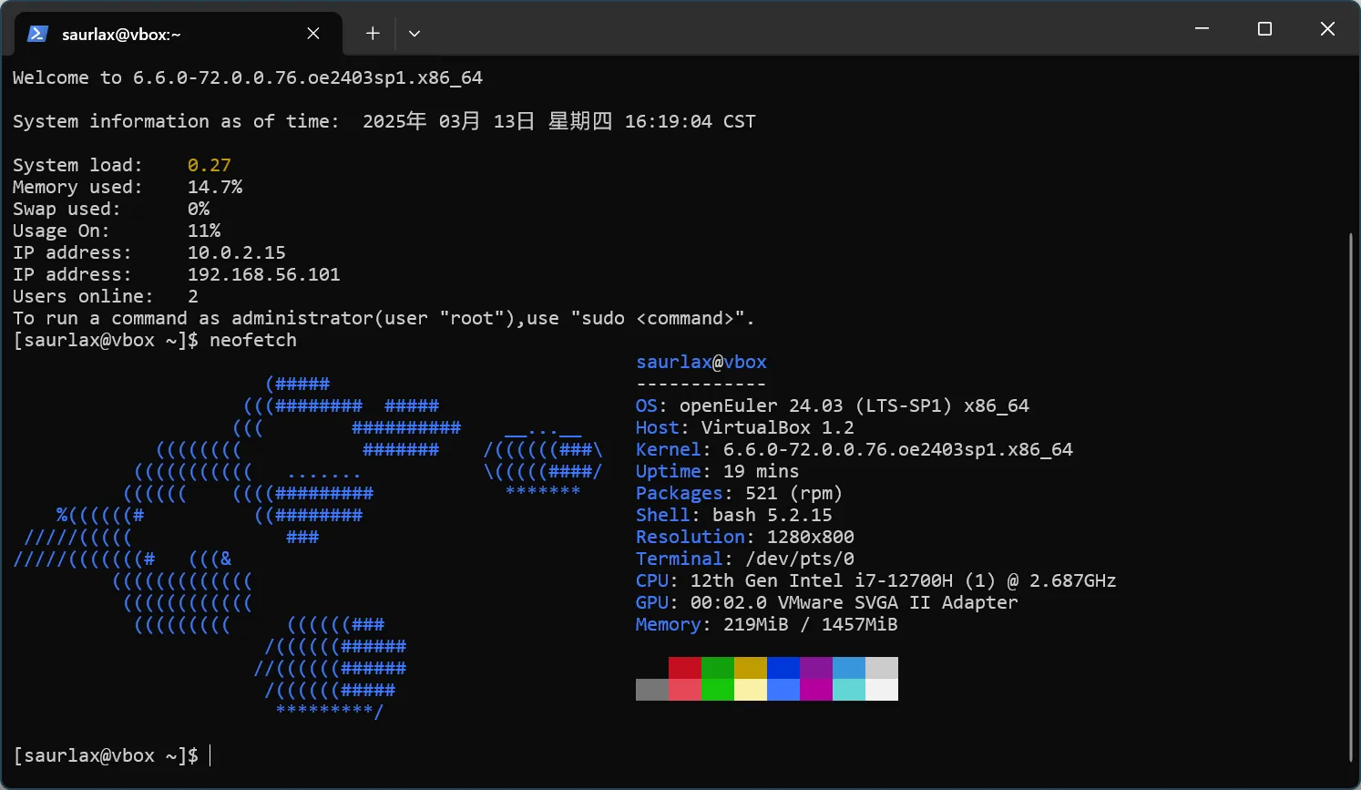 安装完成后,可以在虚拟机中使用 OpenEuler 了。虚拟机默认使用 NAT 网络,可以连接到外网,但是主机无法连接到虚拟机。如果需要主机和虚拟机之间的通信,可以再添加一块 Host-Only 网卡。