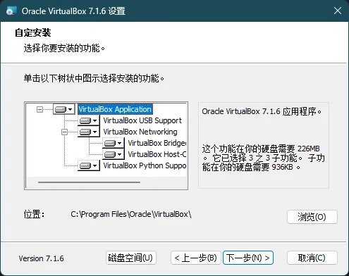 首先下载并安装对应宿主机平台的 VirtualBox。因为软件就算安装在其他盘也会在 C 盘释放一些必要文件,如果需要重装系统时,保留在其他盘的软件也会因为损失某些 C 盘文件而不可用;此外,安装在默认路径也方便搜索教程和查找问题,所以在这里我选择了默认路径安装。