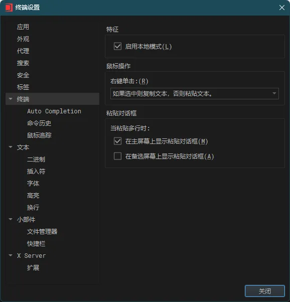 在会话-首选项-设置菜单中,点击终端选项卡,在鼠标操作-右键单击选择框中选择“如果选中则复制文本,否则粘贴文本”。